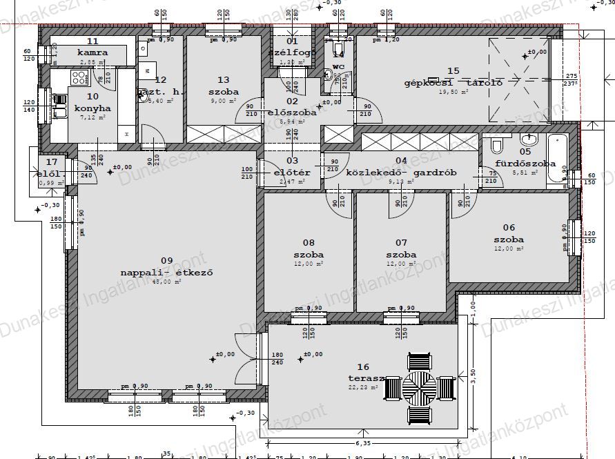 A családi házban 48 nm-es nappali + 7 nm-es konyha amelyből nyílik egy 3 nm-es kamra. Három egész szoba, és egy félszoba, gardróbos közlekedő, fürdőszoba, háztartási helyiség, külön WC, és az előszobából is megközelíthető 19,5 nm-es garázs.